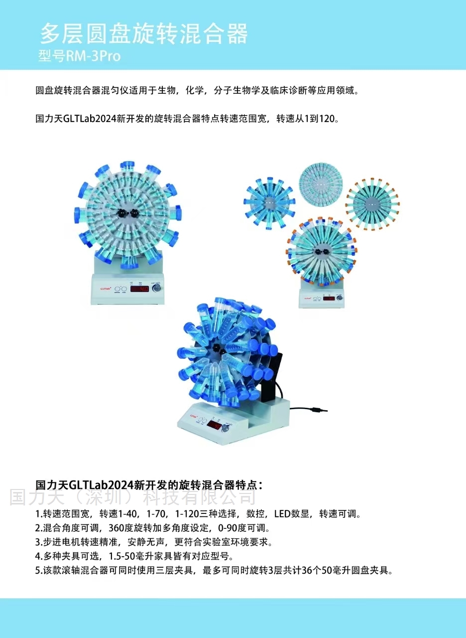选择适合的旋转混匀仪夹具需结合样品容器规格、实验需求、设备适配性及安全稳定性等核心维度综合判断,以下是结构化的选型指南:1. 依据样品容器的类型与规格选型 - 试管/离心管:若处理常规10-18mm直径试管,优先选31位摩擦传动弹性夹具,其适配性强且装卸便捷;若为20-30mm大直径离心管,可选16位大孔径弹性夹具,避免容器晃动。对于多规格试管混合使用的场景,建议选可调式径向丝杆夹具,可通过调节夹板间距兼容5-30mm不同管径,且多层叠加设计能提升通量。 - 玻璃瓶/试剂瓶:直径≤57mm的玻璃瓶,优先选六角钳转头夹具,其三指钳硅胶衬垫可避免刮伤玻璃,同时实现轴向或颠倒混匀;若为大容积试剂瓶(如100-500mL),需选配定制化固定盘夹具,通过弧形夹持爪增强容器的固定稳定性。 - 微量离心管/PCR管:这类小体积容器需专用微孔板适配夹具或微量管阵列夹具,确保单管独立固定,防止高速旋转时管体脱落,同时避免管内样品飞溅。2. 结合实验的混匀模式与工艺需求选型 - 常规颠倒混匀(如血液样品、液液混合):选六角钳转头夹具,其可实现360°颠倒旋转,混匀效率高;若为大批量试管的轻度混匀,试管架转头夹具更适合,能同时固定多管且振动幅度可控。 - 高转速/高频振荡混匀(如核酸提取、细胞重悬):需优先选金属材质刚性夹具,而非塑料弹性夹具,金属夹具的抗振性和耐用性更强,可避免高转速下夹具变形导致的样品容器脱落;同时需确认夹具的锁紧结构(如滚花螺母、手拧螺栓)是否具备防松设计。 - 低温/高温环境下的混匀(如冷链样品、恒温反应体系):需选耐温材质夹具,如不锈钢或耐低温ABS材质,避免夹具在jiduan温度下脆化或变形,同时确保夹具与容器的接触部位无导热死角(如硅胶衬垫需适配-20℃~80℃温度范围)。3. 匹配旋转混匀仪的设备参数选型 - 转速范围 转速>200rpm,需选高刚性锁紧夹具(如滚花螺母固定的试管架夹具),避免离心力导致夹具松脱;低转速(<100rpm)场景可选用弹性夹具,兼顾灵活性与成本。 - 设备接口类型:不同品牌混匀仪的转头接口(如六角轴、螺纹轴)存在差异,需确认夹具的连接端与设备接口匹配,例如六角钳转头夹具仅适配六角轴接口,而摩擦传动夹具多为通用卡扣式接口。 - 设备载重限制:夹具自身重量+样品总重量需≤设备额定载重,若处理大容积样品(如500mL试剂瓶×10),需选轻量化合金夹具,同时预留10%-20%载重冗余,防止设备过载损坏。4. 兼顾实验安全性与易用性选型 - 防泄漏/防污染需求:生物样品或腐蚀性试剂的混匀,需选带密封挡边的夹具,挡边可拦截意外泄漏的样品,避免污染设备;同时夹具表面需具备耐酸碱涂层(如特氟龙镀层),便于清洁消毒。 - 操作便捷性:高频更换样品的场景(如临床检验),优先选快拆式夹具(如卡扣式弹性夹具),可实现秒级装卸;若为批量长期实验,手拧螺栓可调夹具更稳定,且调节后无需反复校准。5. 特殊行业的定制化需求选型 - 新能源电池材料制备(如电极浆料混匀):需选防腐蚀夹具(耐电解液腐蚀的不锈钢材质),同时夹具需适配定制化的浆料储存罐,且具备大载量设计(单夹具载重≥5kg),满足浆料的高粘度混匀需求。 - 医疗诊断领域(如血液、尿样检测):需选**医用级无菌夹具,表面经过环氧乙烷灭菌处理,且结构便于灭菌后清洁,避免交叉污染。
